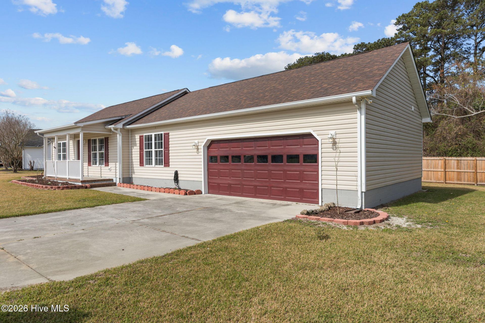 At 106 Goldie Lane, you're greeted by a charming, covered front porch and a beautiful blooming garden bed welcoming you home. Nestled in the heart of the countryside on nearly a full acre of land, this delightful 3-bedroom, 2-bathroom offers the perfect blend of peace and everyday comfort.Step inside and feel the sunshine in a bright, airy open-concept floor plan that manages to feel both wonderfully spacious and intimately snug. The heart of this home is the inviting living room, complete with a flickering fireplace that's just waiting for you to curl up next to it with your favorite book on a chilly evening. The interior flows with a gentle, natural grace, masterfully balancing open spaces for together-time with quiet corners for reflection.At the center of it all is the sun-drenched kitchen, a heartwarming space designed for gatherings and creating delicious meals. The thoughtful split-bedroom layout ensures everyone has their own peaceful retreat, especially the primary suite, your own private haven featuring a generous walk-in closet for all your treasures.Do you love to host? Sliding glass doors lead you out to an expansive back deck, your very own front-row seat for starlit nights, summer BBQs, and joyful laughter. Whether you're sipping a quiet morning coffee on the porch or gazing out at the vast, emerald views of your sprawling backyard, this home is a true slice of Beulaville paradise. With a solid foundation and a spirit that invites you to make it uniquely your own, come discover why life is just a little bit sweeter at 106 Goldie Lane!