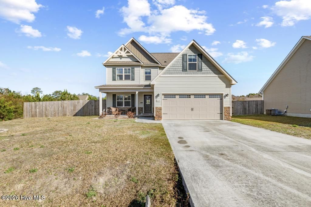 Beautifully situated in the heart of Hubert, 120 Sonia Drive offers a sophisticated living experience on a tranquil cul-de-sac. This residence has been meticulously designed to provide an environment of both refined comfort and seamless connection. The interior features a flickering fireplace in the living room and a spacious, elegant kitchen island, perfect for both daily living and formal occasions. The open-concept layout ensures a natural transition from the kitchen and living space to the expansive, private fenced-in backyard.Upstairs, the primary suite serves as a true sanctuary. With its elegant tray ceilings and a spa-inspired bathroom, complete with a soaking tub and a separate walk-in shower, it's the perfect place to unwind after a long day. You'll fall in love with the hidden gem of the home: a private, ''hide-away'' room tucked within the primary suite, offering a quiet, cozy corner for creativity or focus. With a spacious second floor laundry room and two additional guest rooms featuring a dual-sink vanity, every inch of this home is crafted for ease and joy. Come see why 120 Sonia Dr is more than just a house, it's where your next chapter begins.