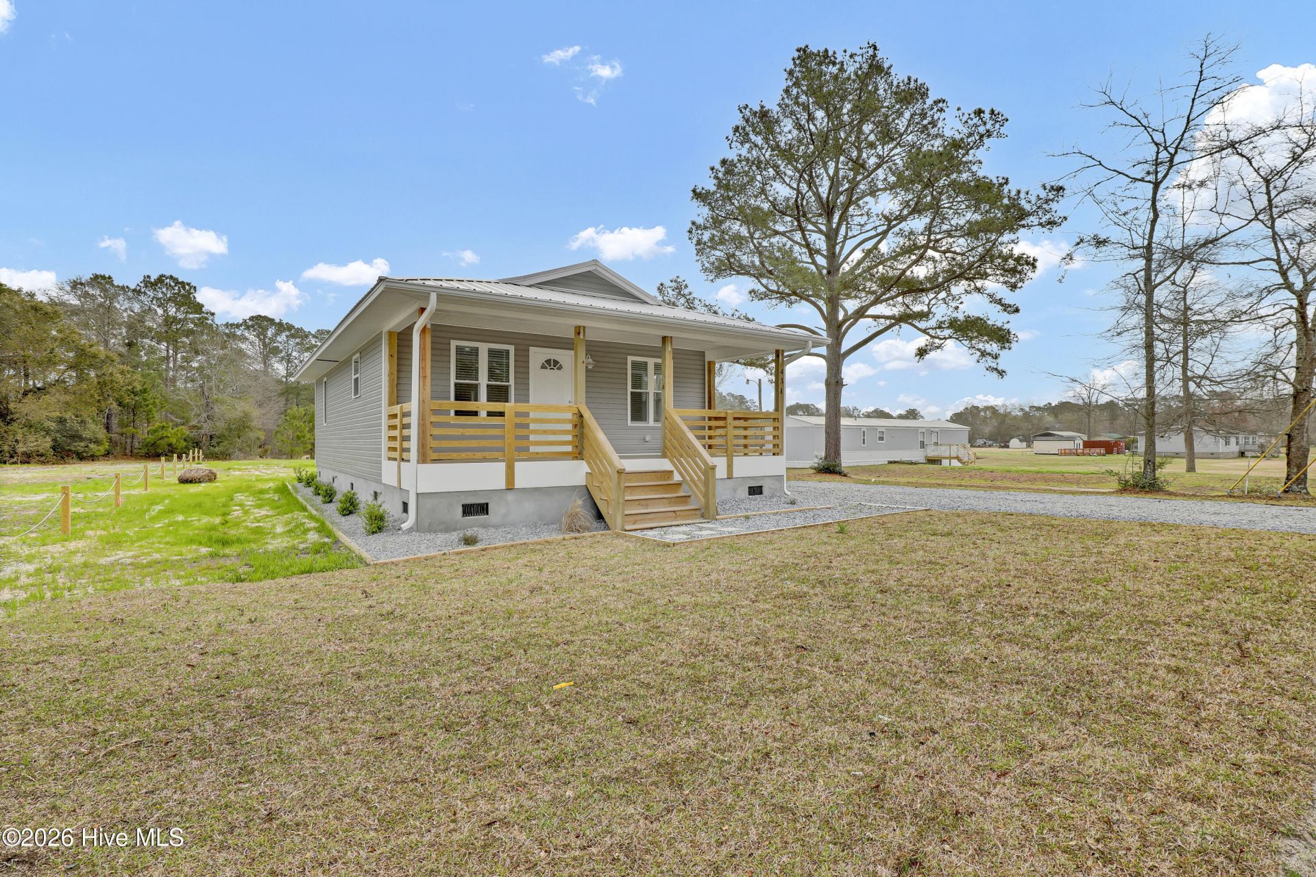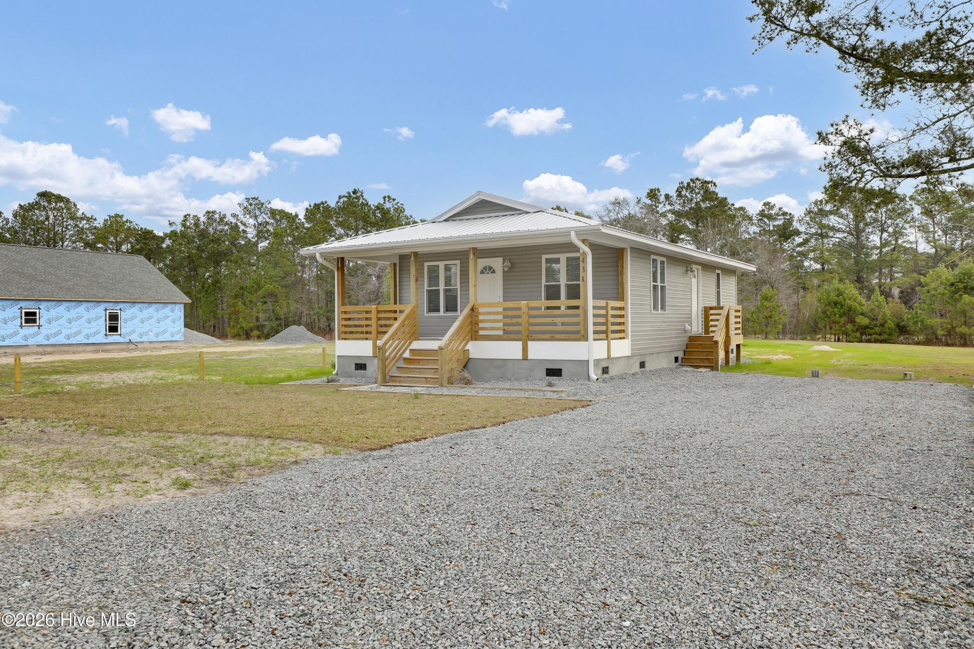 Take a look at the cutest cottage in Holly Ridge! A covered front porch spans the width of the house (24') with natural wood railings and posts adding warmth and contrast. Inside features an open layout, a 6' island perfect for cooking and entertaining, shaker-style cabinets, and charming window and door casings. The well designed bathroom features a gorgeous tiled shower and both bedrooms have ceiling fans installed. On top of all the charm, you will love the peace of mind of a new metal roof (2025). Just 3 minutes down the road is the Morris Landing fishing pier and boat ramp. Tucked perfectly in Holly Ridge, you have your choice of beaches: short 10 minute drive to Surf City and 14 minute drive to North Topsail Beach.