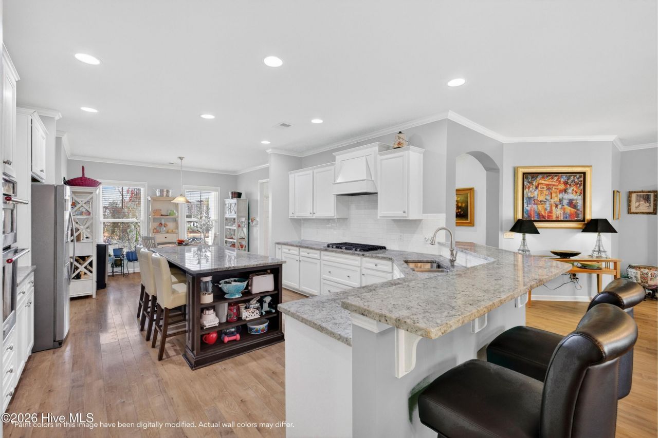 This well-maintained Tangerly Oak floor plan offers the ease of single-level living paired with inviting spaces for gathering, relaxing, and enjoying the coastal lifestyle. The seller is offering a $5,000 paint allowance in the form of closing cost concessions, giving buyers the opportunity to personalize the home to their taste.Inside, the open layout creates a natural flow between the kitchen, dining, and living areas. The spacious living room centers around a gas fireplace and large windows that bring in natural light. Hardwood flooring and crown molding add warmth and continuity throughout the main living areas.The gourmet kitchen is both functional and welcoming, featuring granite countertops, abundant cabinetry, a 5-eye gas cooktop, and a huge center island with seating and storage. Whether preparing meals or hosting friends, the layout keeps everything within easy reach while remaining open to the heart of the home.The primary suite serves as a peaceful retreat, featuring a spa-inspired en suite bath with dual vanities, a soaking tub, and a separate walk-in shower, along with an oversized walk-in closet. A versatile flex room currently used as an office features French doors and polished ceramic tile flooring, creating an ideal space for work, hobbies, or a quiet sitting room. The second bedroom includes its own en suite bath and is positioned across the home from the primary suite, offering comfortable privacy for visiting guests.Outdoor living becomes a natural extension of the home with a large screened porch overlooking the fenced backyard, creating a quiet place for morning coffee, evening conversations, or simply enjoying our mild coastal climate. The adjacent patio offers additional space for grilling or outdoor seating. A whole home generator offers additional peace of mind.Residents of Del Webb's 55+ senior living community enjoy low-maintenance living with HOA-covered lawn care along with access to a full suite of resort-style amenities. The community clubhouse hosts regular social events, and amenities include indoor and outdoor saltwater pools, a fitness center, pickleball, tennis, bocce, a dog park, walking and biking trails, and a kayak launch.Located just minutes from downtown Wilmington, area beaches, and the dining, shopping, and waterfront atmosphere of Riverlights Marina Village, this home offers the best of active coastal living.