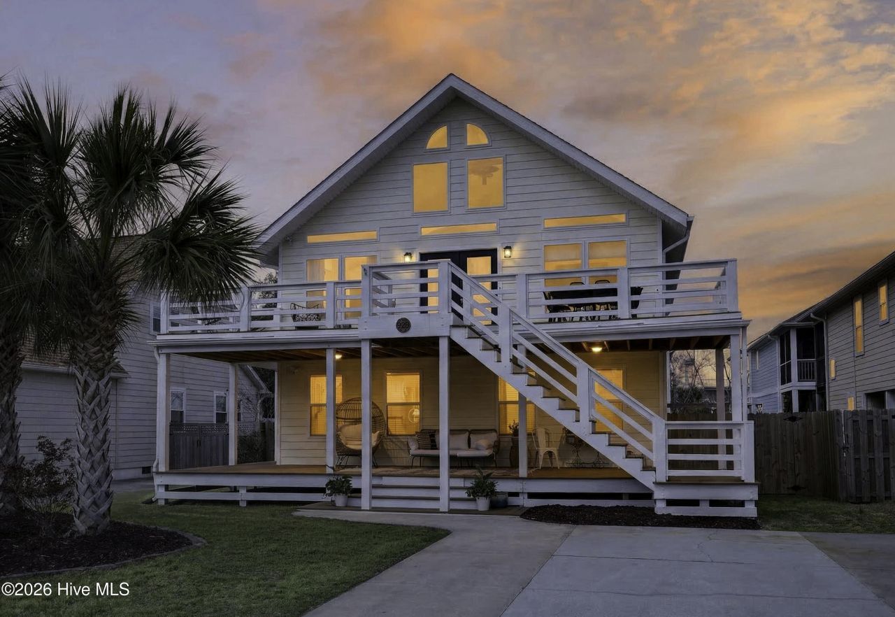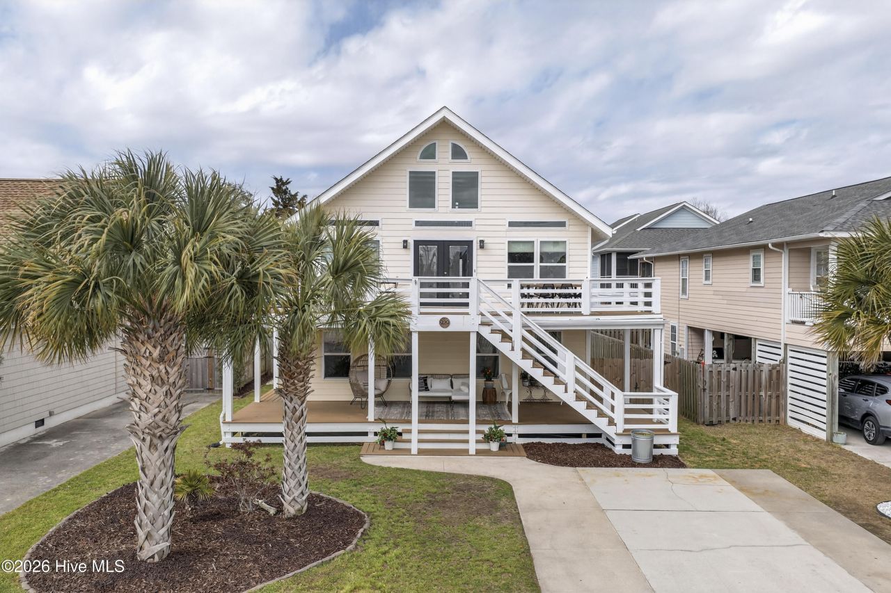 This beautifully maintained 5-bedroom, 5-bath coastal retreat in the highly desirable Carolina Sands community offers the space, upgrades, and lifestyle that make island living truly exceptional. Recent improvements include a brand-new fortified roof, fresh interior paint throughout and professional landscaping, providing peace of mind and move-in-ready convenience. As you arrive, you're welcomed by a covered front porch designed to capture the ocean breeze, the perfect place to start your morning or unwind in the evening. Step inside and discover a versatile first-floor guest level featuring three bedrooms, each with its own full bath, along with a comfortable living area and kitchenette that opens to the side lawn--ideal for guests, extended family, or flexible living arrangements. The second floor serves as the heart of the home, featuring a spacious kitchen with abundant pantry storage and a large center island perfect for gathering. The adjacent living area is bright and inviting, showcasing lofty ceilings, clean architectural lines, and French doors leading to the open front deck. From here, enjoy one of the best seats on the island for the Thursday night Carolina Beach fireworks. The owner's suite offers a private retreat with three closets and a beautifully appointed bath featuring a tile walk-in shower. On the third floor, a massive bonus room with three closets and a full bath provides exceptional flexibility--perfect as a 5th bedroom, media room, home office, or private guest suite. Outdoor living is just as inviting with multiple spaces designed for relaxing and entertaining, along with two outdoor storage buildings ideal for bikes, beach gear, and lawn equipment. Located outside of the AE flood zone and within the sought-after Carolina Sands community, residents enjoy low HOA dues and outstanding amenities, including a community pool, tennis courts, clubhouse, private beach access with parking for golf carts and bicycles, playground and picnic areas. With its thoughtful layout, major upgrades, and unbeatable island lifestyle, this coastal gem checks every box for full-time living, or a second home.